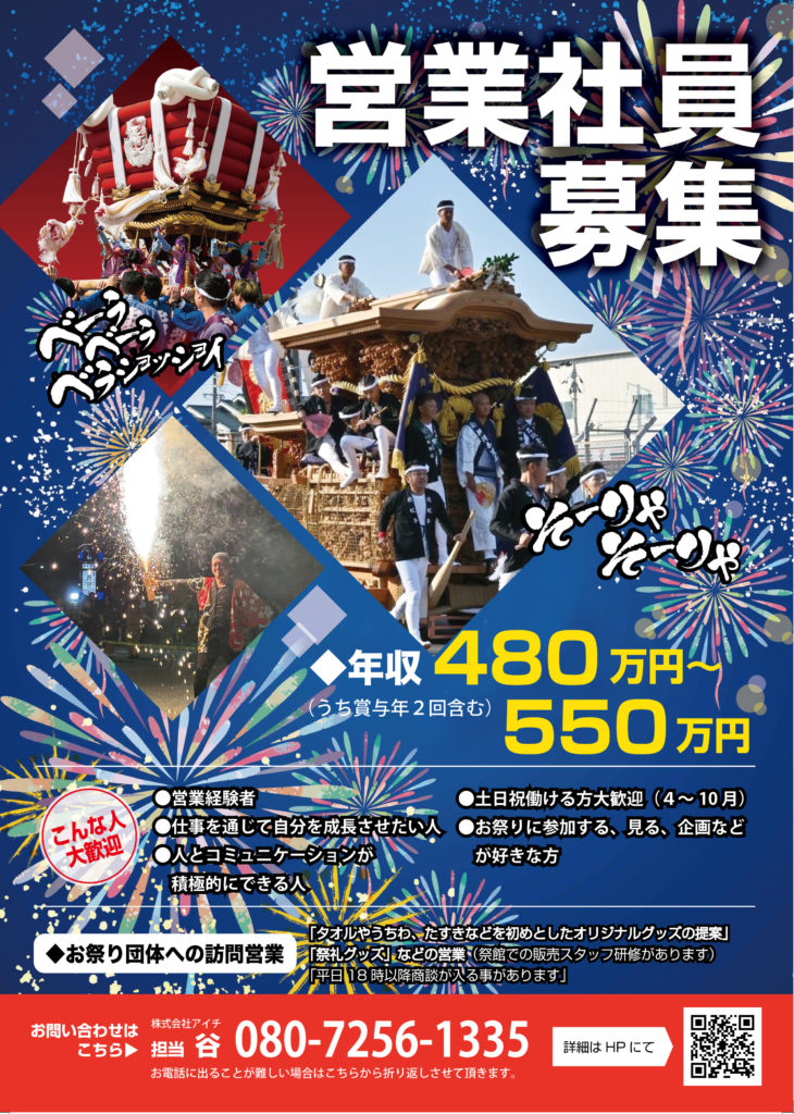 →「タオルやうちわ、たすきなどを初めとしたオリジナルグッズの提案」「祭礼グッズ」などの営業をして頂きます。