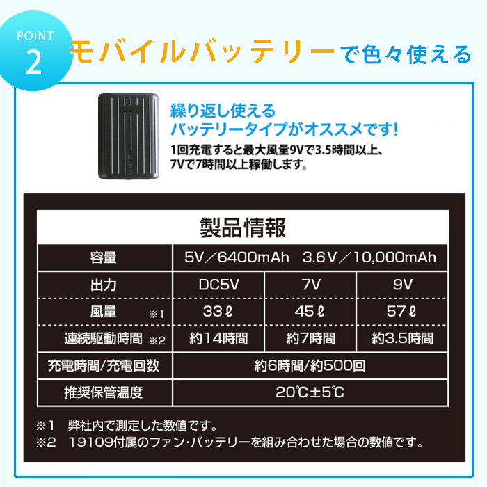 | 注意事項 | 返品可 ※未使用品の場合に限ります。 ※パッケージ、タグなどを紛失されている場合は、返品をお断りする場合がございます。 ※返品をご希望の場合は、まずショップへご連絡をお願いいたします。※旧モデルのバッテリーやファンとは互換性がありませんのでご注意下さい。 ※こちらの商品は株式会社 空調服 の製品ではございません。「 空調 」(登録第4697002号)および「 空調服 」(登録第6072017号)は、株式会社セフト研究所及び株式会社 空調服 の登録商標であり、株式会社空調服、または株式会社空調服のグループの商品(空調服)を示す識別標識として使用されております。現在類似の商品は 扇風機付きウェア 、ファン付きウェア 、 電動ファン付きウェア 、 空調作業服 と呼ばれております。。 |