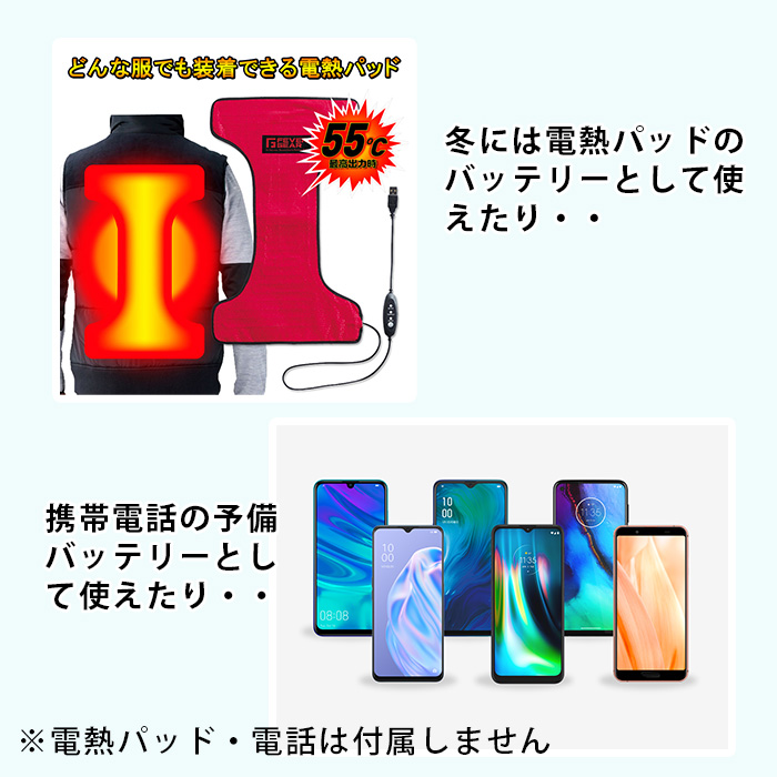 | 商品説明 | こんな時にお使いください!音楽FES スポーツ観戦 ゴルフ 釣り サバイバルゲーム 散歩 ウォーキング アウトドア レジャー 庭仕事 DIY などで活躍中! 取り付け簡単でスイッチを押すだけで涼しい風が流れ始めます。 また、バッテリーがモバイルバッテリーになっており、こちらの空調ウェアだけでなく、別売りのヒートアイテムやお持ちの携帯電話の予備バッテリーとしても使うことができます。 ジェネリック空調ウェア コンプリートセット |