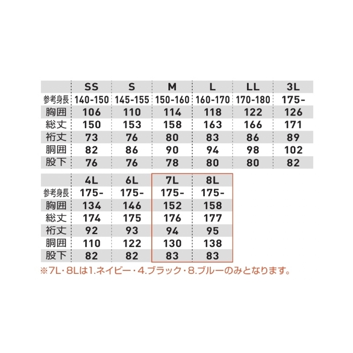 注意事項 ※7L・8Lは1.ネイビー・4.ブラック・8.ブルーのみとなります。