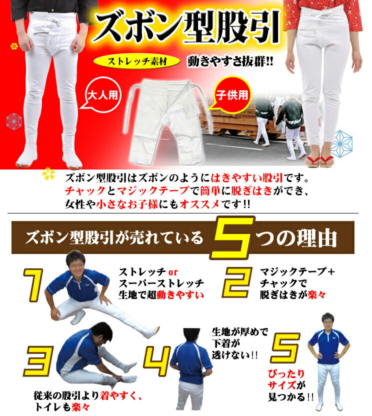 | 商品説明 | 縦横伸びのスーパーストレッチ素材の生地で作ったズボン型股引の進化バージョン! 最高の履き心地を実現しました。縦横のびのびで本当に楽ちん楽ちん!走っても疲れ知らず。これを一度着ると、他のズボン型は履けなくなりますよ! 腹当付き、前ファスナーでらくらく!気になるお尻は生地が二重になっているので股割れする心配もなく女の子も安心して着用して頂けます!! 大阪のだんじり祭では、ほとんどの方がズボン型股引をはいています。お子様から青年やご年配の方まで幅広くご利用いただける一押し商品です。 |
