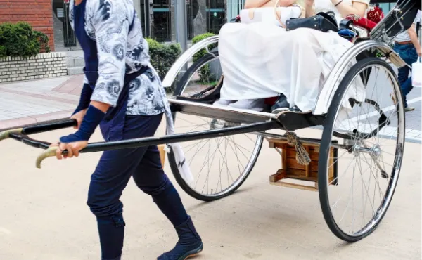 ガタガタの砂利道やコンクリート上で長時間走る人力車。エアークッションが足への衝撃を吸収し、走りをサポートします。